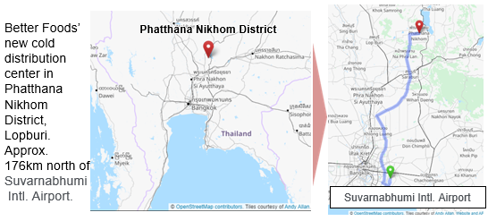 Food industry is a major industrial sector in Thailand, and Better Foods plants to install a refrigeration system with natural refrigerants (NH3/CO2) in their new cold distribution center. This refrigeration system employs an “indirect cooling method,” which uses ammonia to cool CO2 and then CO2 is transported to a cooler in a cold storage. By this method, ammonia is contained in the machine room alone and only CO2 is circulated in the cooler, ensuring the occupational safety. Also, the system uses approximately 20% less energy in comparison to conventional HFC refrigerators.