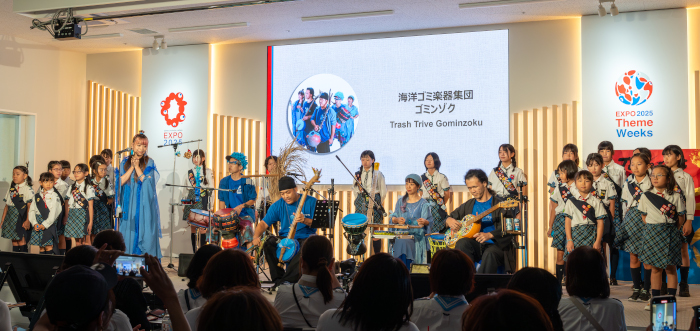 オープニングでは、書家・アーティストの岡西佑奈氏が、地球環境保全の精神を表現する書道パフォーマンスを披露しました。 開会挨拶ではUNEP産業・経済局長 シーラ・アガワル=カーン氏が、世界に向けた海洋プラスチック汚染の軽減と解決に向けたUNEPからのメッセージを発信しました。 次のグローバル・ダイアログでは、UNEP、ユース代表 ガールスカウト、民間企業、芸人・プロデューサーが登壇し、持続可能な未来に向けた対応策や決意を共有し、活発な意見交換を行いました。それぞれの立場は違っても、一人一人にふさわしい役割と使命があり、小さなことでも実際に行動をすることが重要であることが示されました。その後、「いのち会議」を代表して、大阪大学総長補佐堂目特任教授が“いのち宣言メッセージ”を紹介しました。最後に、ゴミンゾクによる海洋ごみ楽器によるライブ演奏に、ガールスカウトのメンバーと古坂大魔王氏が参加し、楽しい音楽エンターテインメントで会場が一体となり大きく盛り上がりました。そして閉会の辞では、GEC理事長の下條真司が、「未来を担う次世代ユースらを含む我々全員が、地球環境と未来のためにサステナブルな生活を“Rethink(再考)”し、行動して欲しい」と呼びかけ、イベントは成功裏に終了しました。 2030年までに「誰一人取り残さない」 SDGs実現を加速するためのアクションを世界に伝える、万博のレガシーにふさわしい意義深いイベントとなりました。